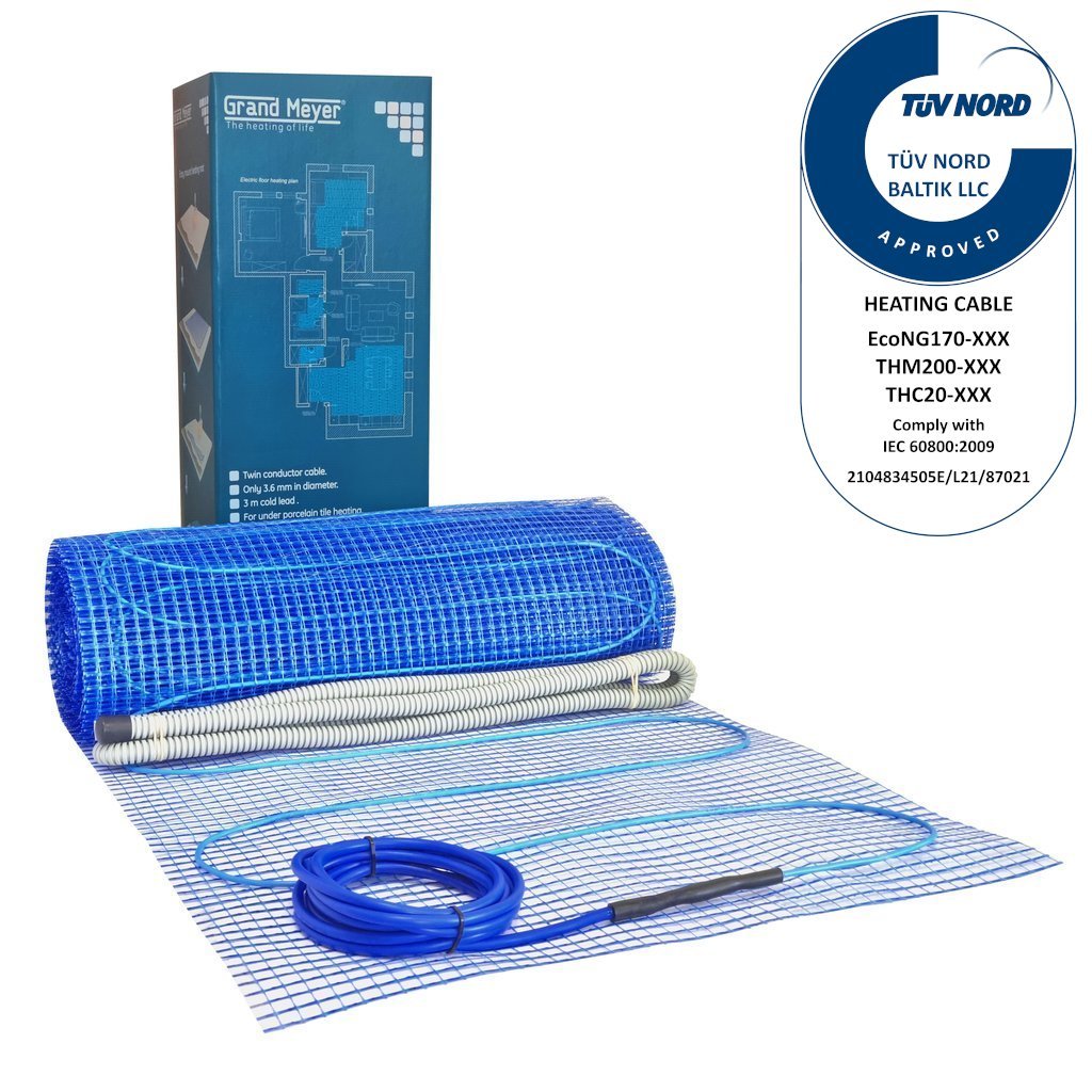 Нагревательный мат Grand Meyer THM200-XXX представляет собой тонкий нагревательный элемент, который волнообразно закреплен на стекловолоконной сетке шириной 50 см и длиной до 2800 см, в зависимости от типа и предназначен для укладки в слой кафельного клея либо бетонную стяжку. Кабель изготовлен с применением высококачественной термостойкой тефлоновой изоляции и защищен экраном. Для подключения мата к сети служит холодный провод длиной 3 метра. Удельная мощность мата составляет 200 Ватт/м2 при напряжении сети 230 Вольт. Диаметр сечения провода 3,6 мм.