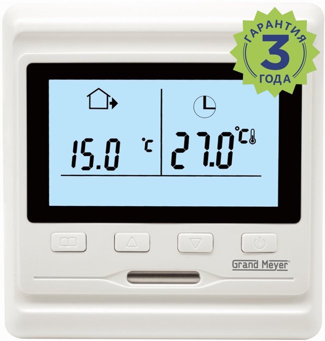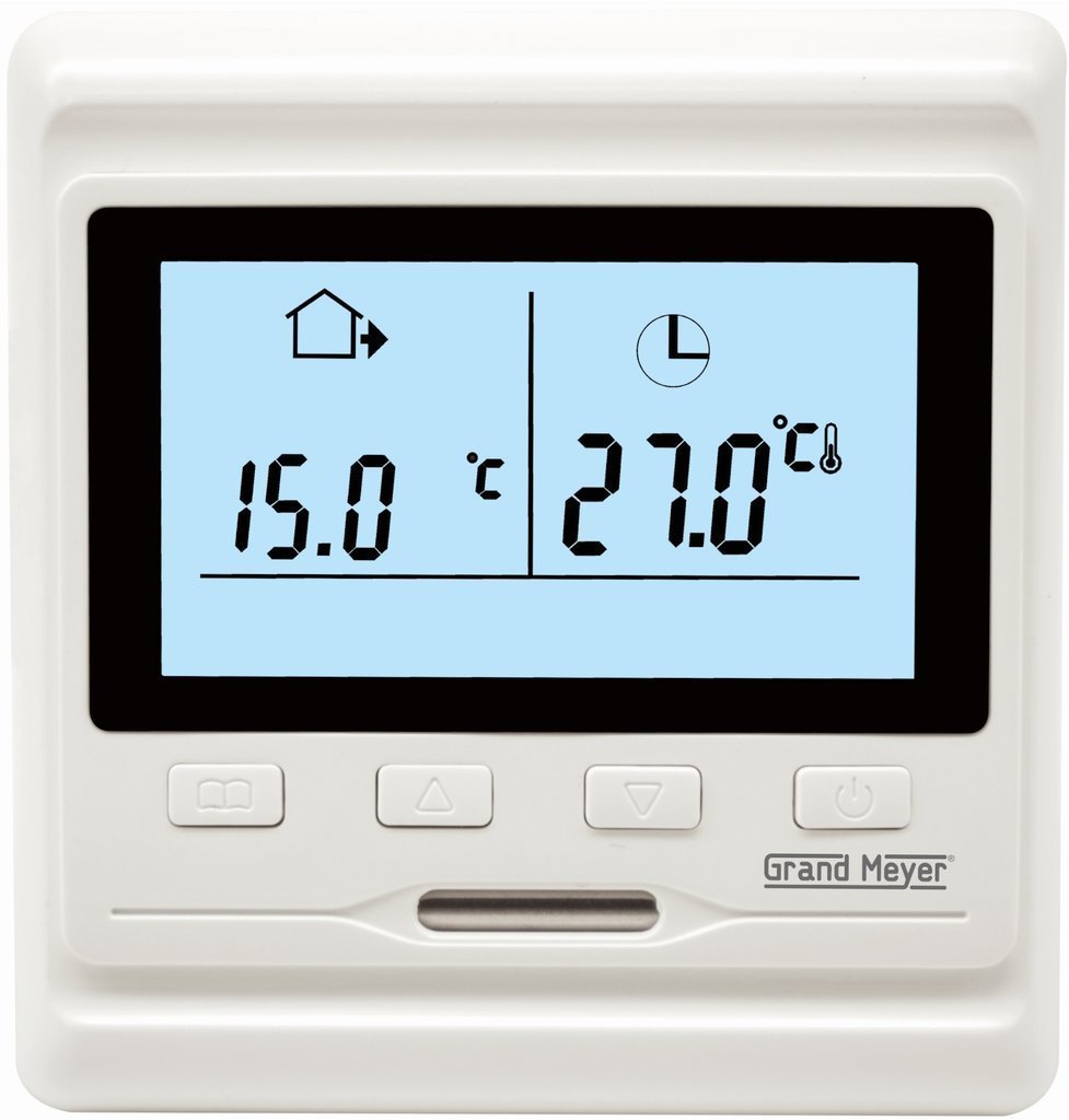 Grand Meyer HW500, программируемый терморегулятор для управления отоплением электрического типа. Возможность программируемого а так же ручного управления. Возможность установки недельного периода 5+2/6+1/7 дней. Максимальная нагрузка 3600 W. Установка в стандартную монтажную коробку. Память настроек при отключении питания. Огнезащитный пластик. NTC датчик. Диапазон установки: от +5оС до +35оС (заводские)