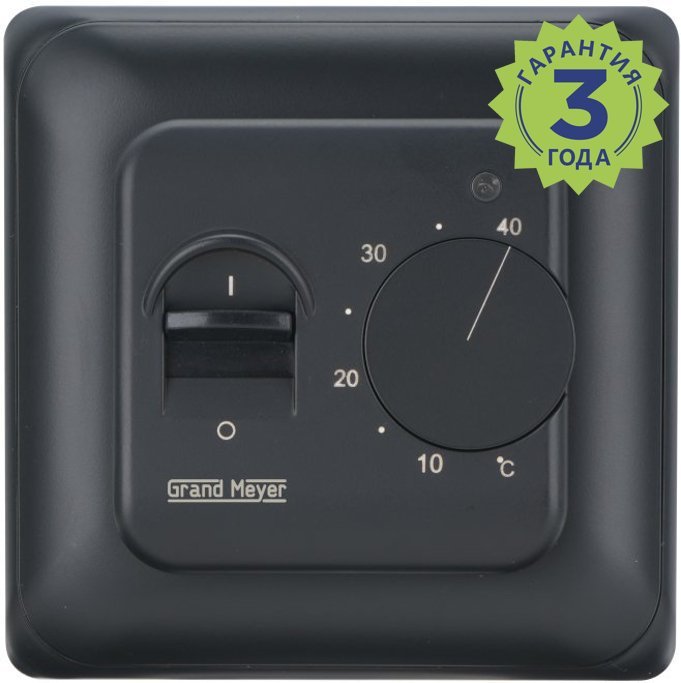Grand Meyer MST-10, терморегулятор предназначен для монтажа в стандартную монтажную коробку. Пределы регулирования терморегулятора от +5оС до +40оС. Предназначен для эл.теплых полов и других электрических нагревательных элементов. Индикация включения нагрева. Материал корпуса - самозатухающий ПВХ. NTC датчик длиной 3 м.