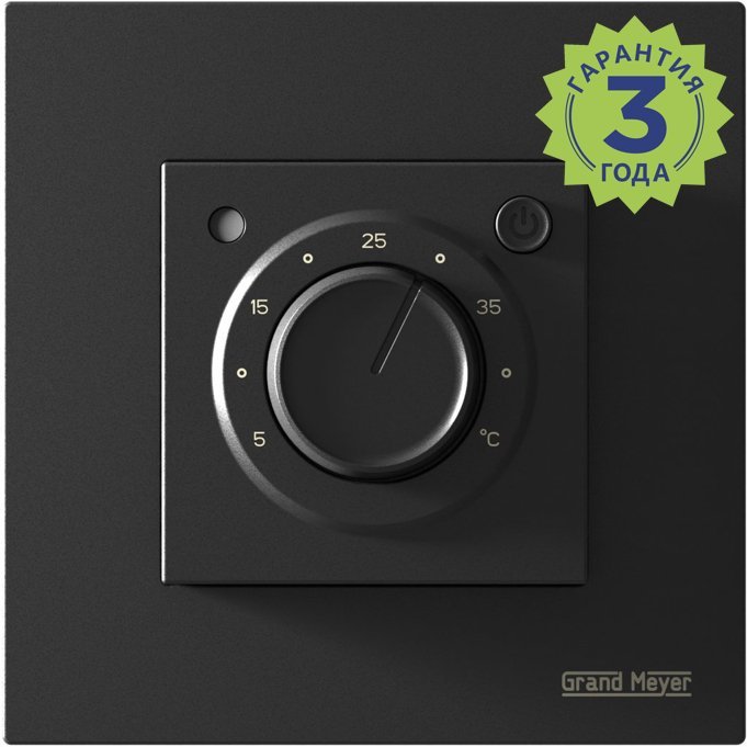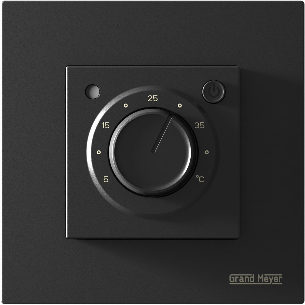 Grand Meyer MST-9, электронный терморегулятор для управления электрическим теплым полом. Имеет отдельный выключатель питания и светодиодную индикацию работы теплого пола. Комплектуется датчиком температуры длиной 3м. Терморегулятор предназнчен для скрытого(утопленного) монтажа в гнезде монтажной коробки. Возможность установки в рамку Schneider Unica, Schneider Atlas.
